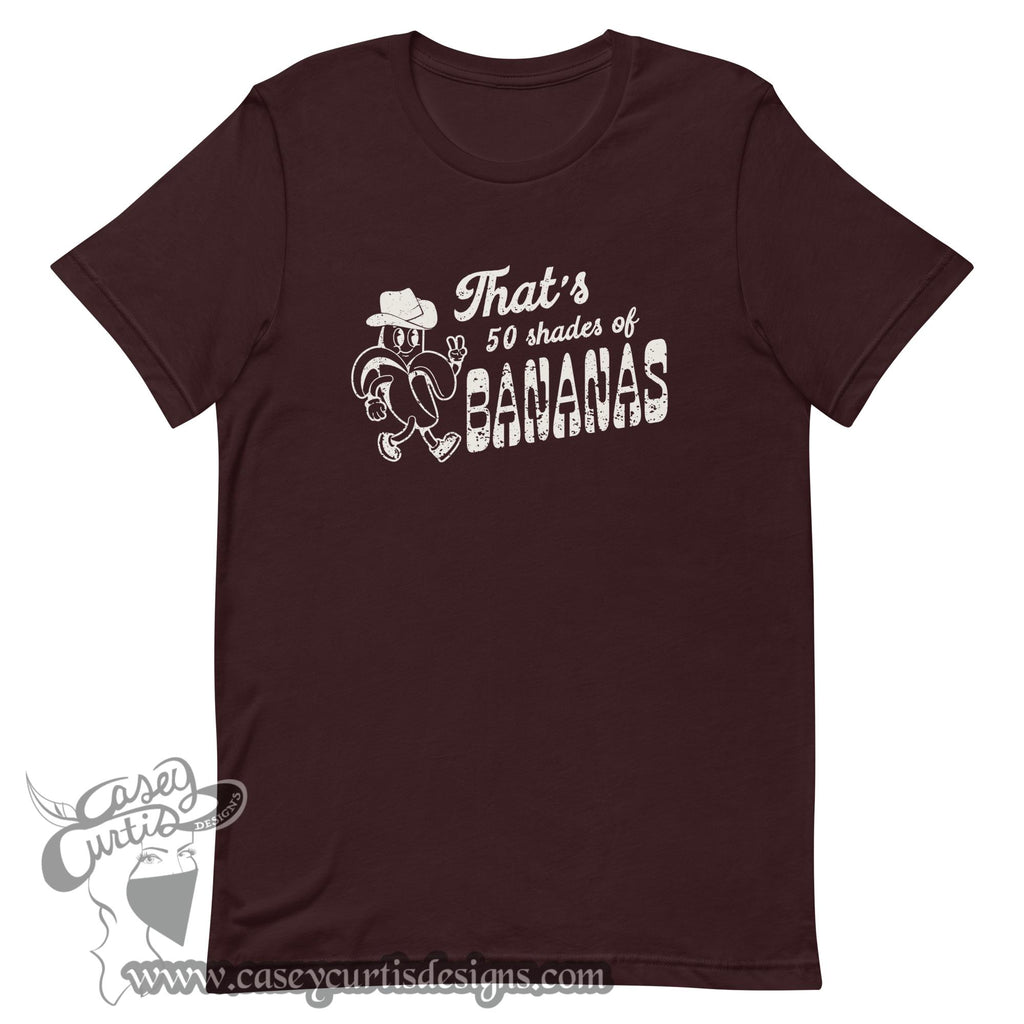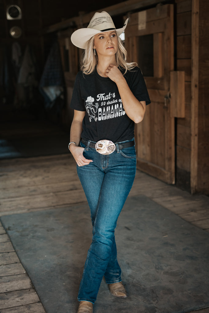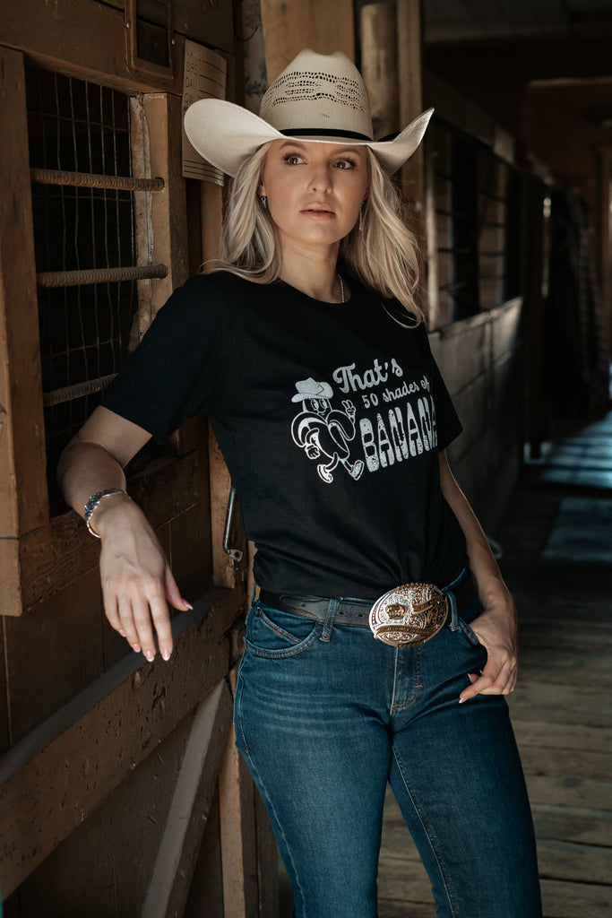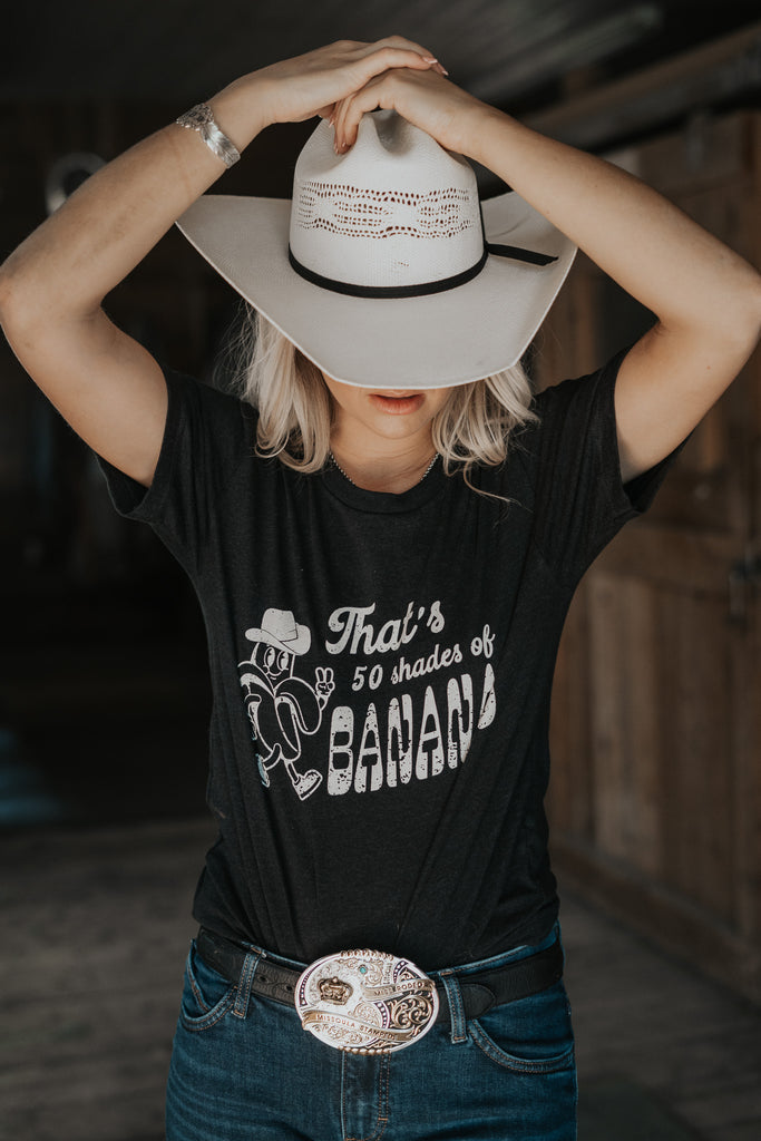 That's 50 shades of BANANAS western cowboy tee. Need a cowgirl gift? Why not a funny tee?! This t-shirt is everything you've dreamed of and more. It feels soft and lightweight, with the right amount of stretch. It's comfortable and flattering for all.