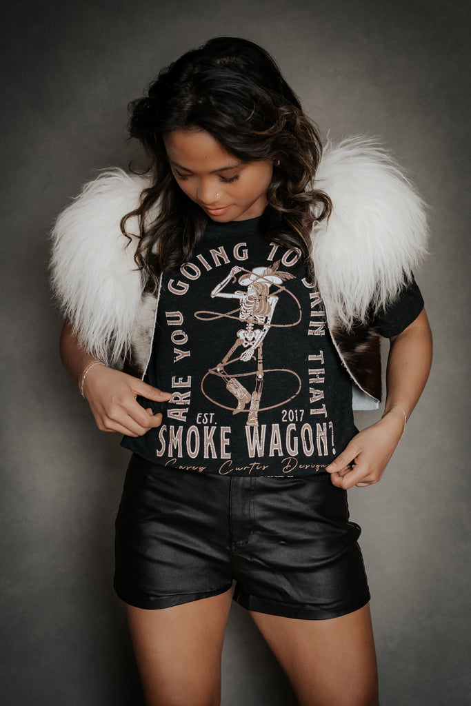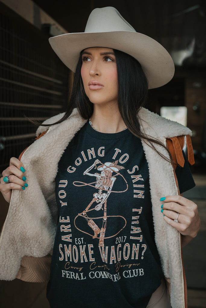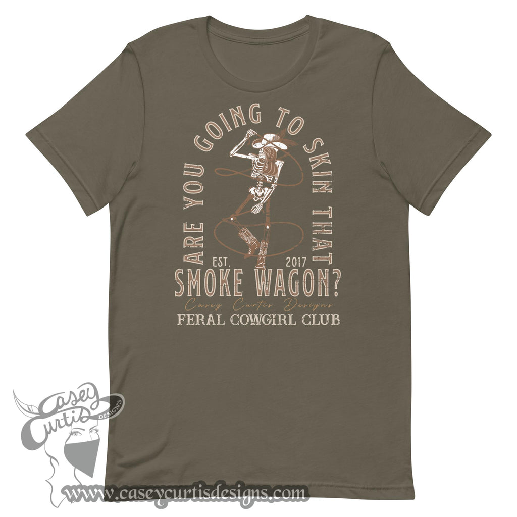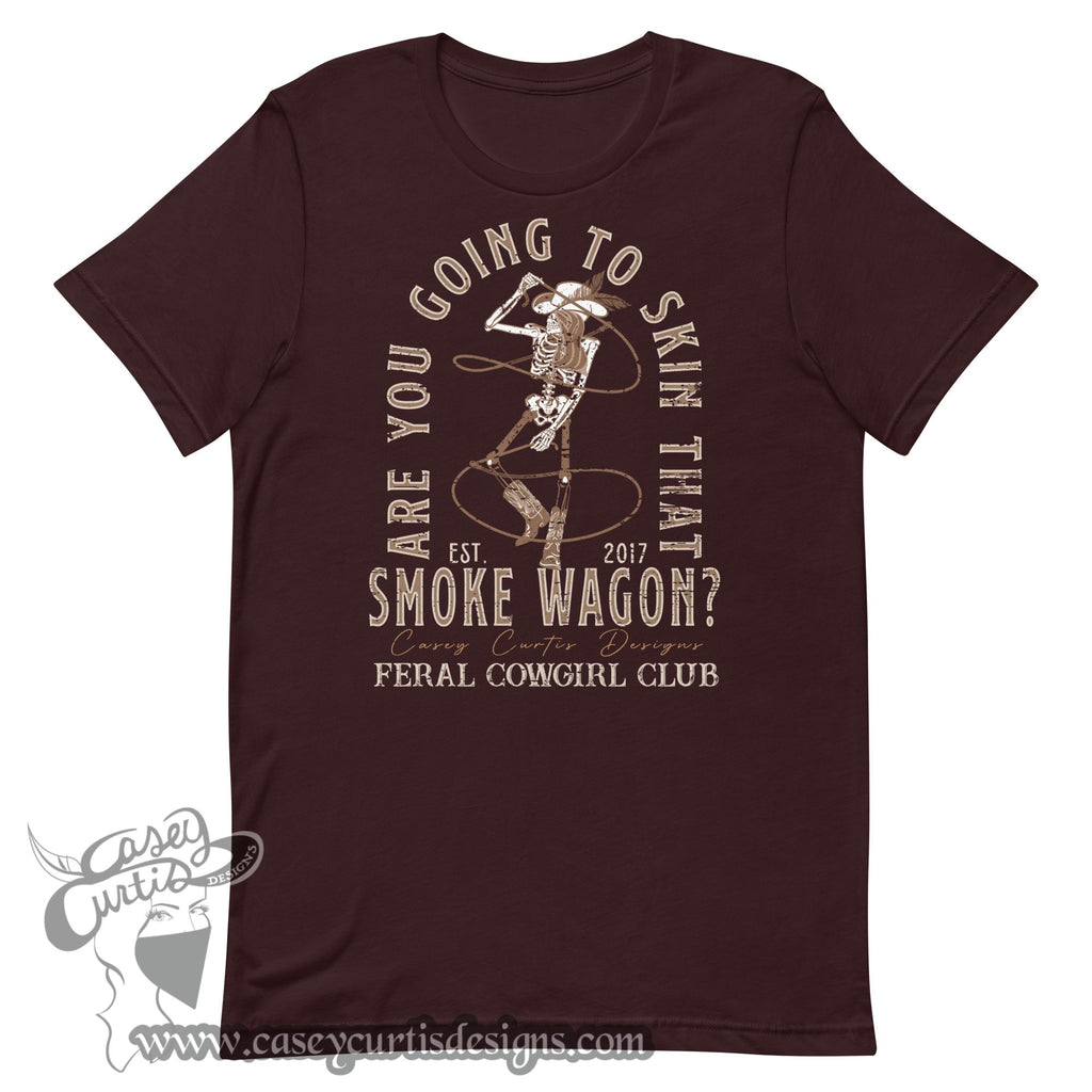 Skin that Smoke Wagon Western t-shirt. Embrace your inner feral cowgirl with this tee; it feels soft and lightweight with the right amount of stretch. It's comfortable and flattering for all. The perfect cowgirl gift or NFR tee!